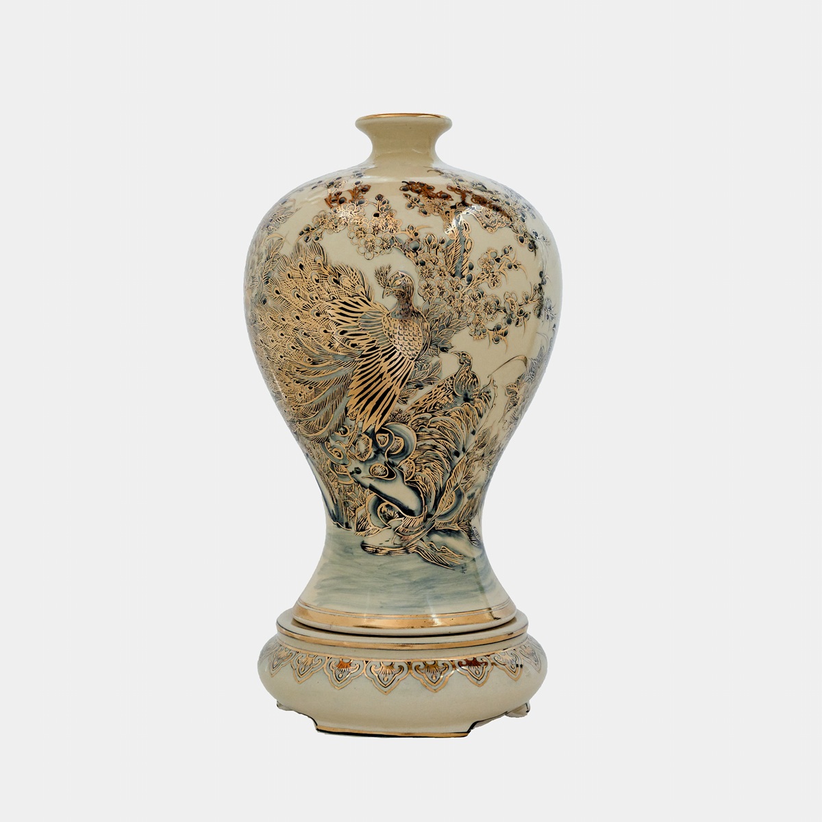 Mai Bình Công Danh Phú Quý vẽ vàng là tuyệt tác gốm sứ mang biểu tượng vinh hoa, thịnh vượng và thành công. Họa tiết chim công khoe sắc bên hoa mẫu đơn thể hiện công danh rạng rỡ, phú quý bền lâu và hạnh phúc viên mãn.