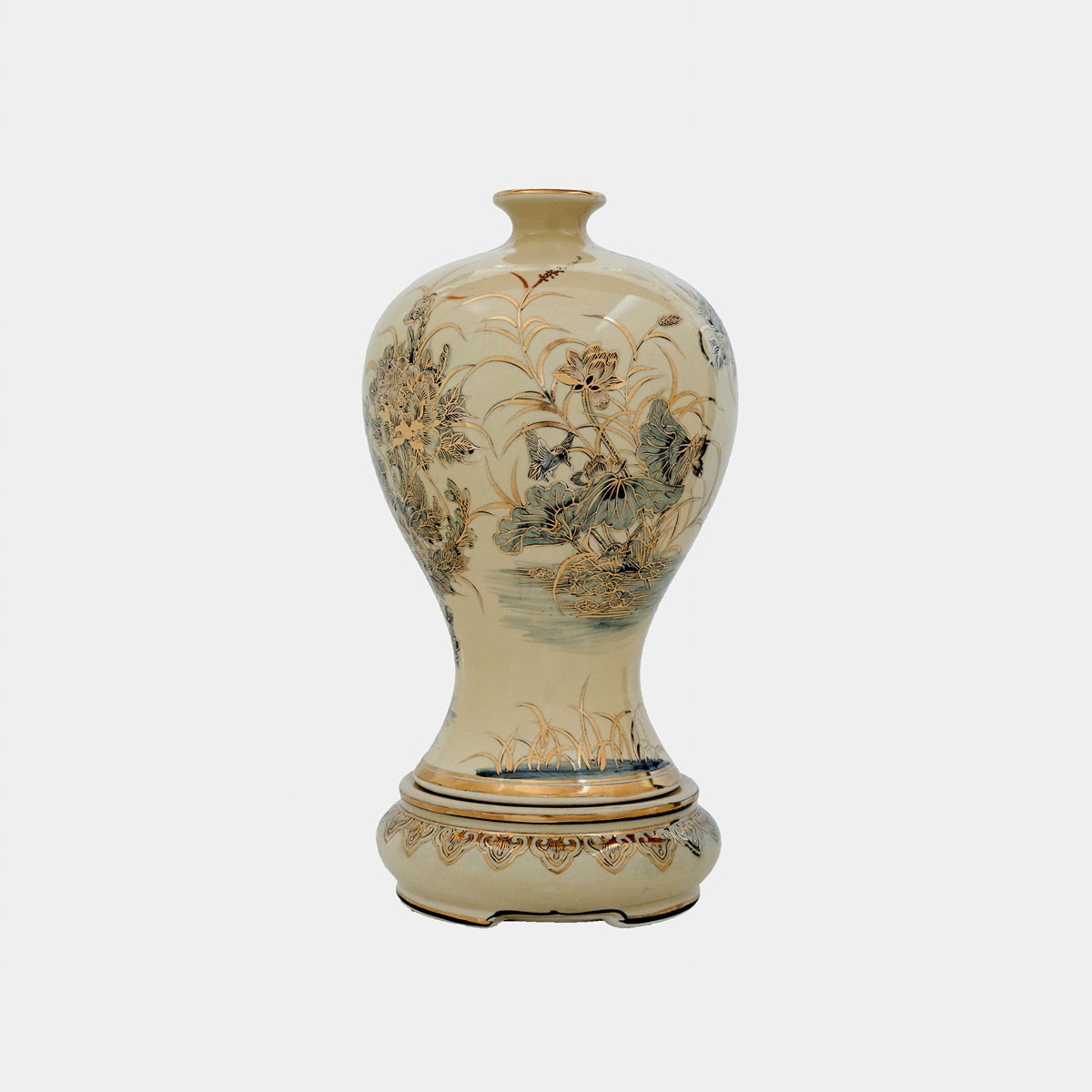 Bình được vẽ vàng 24K thủ công tỉ mỉ, từng chi tiết lông công, cánh hoa đều được thể hiện tinh tế trên nền men ngà sang trọng. Dáng mai bình uyển chuyển, thân trên nở, cổ thon, đáy tròn đầy – tượng trưng cho sự viên mãn, hút lộc và cát tường trong phong thủy.